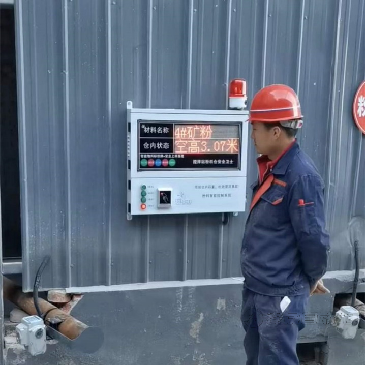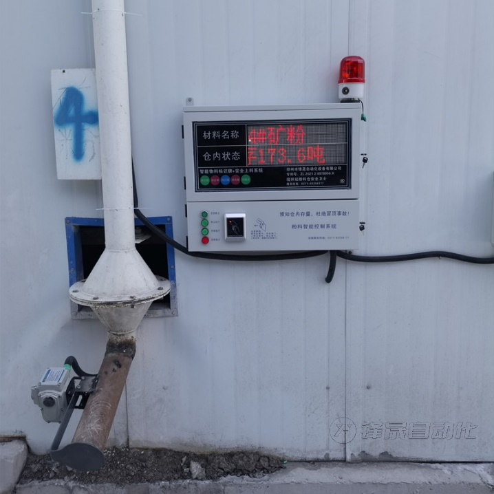 在倉頂?shù)摹皞€別位置”安裝料位探測儀、阻旋開關(guān)各一臺,通過有線+無線方式實現(xiàn)與磅房管理觸摸屏連接,阻旋開關(guān)受控于料位計探測儀,信號及電源均取自于料位計探測儀。