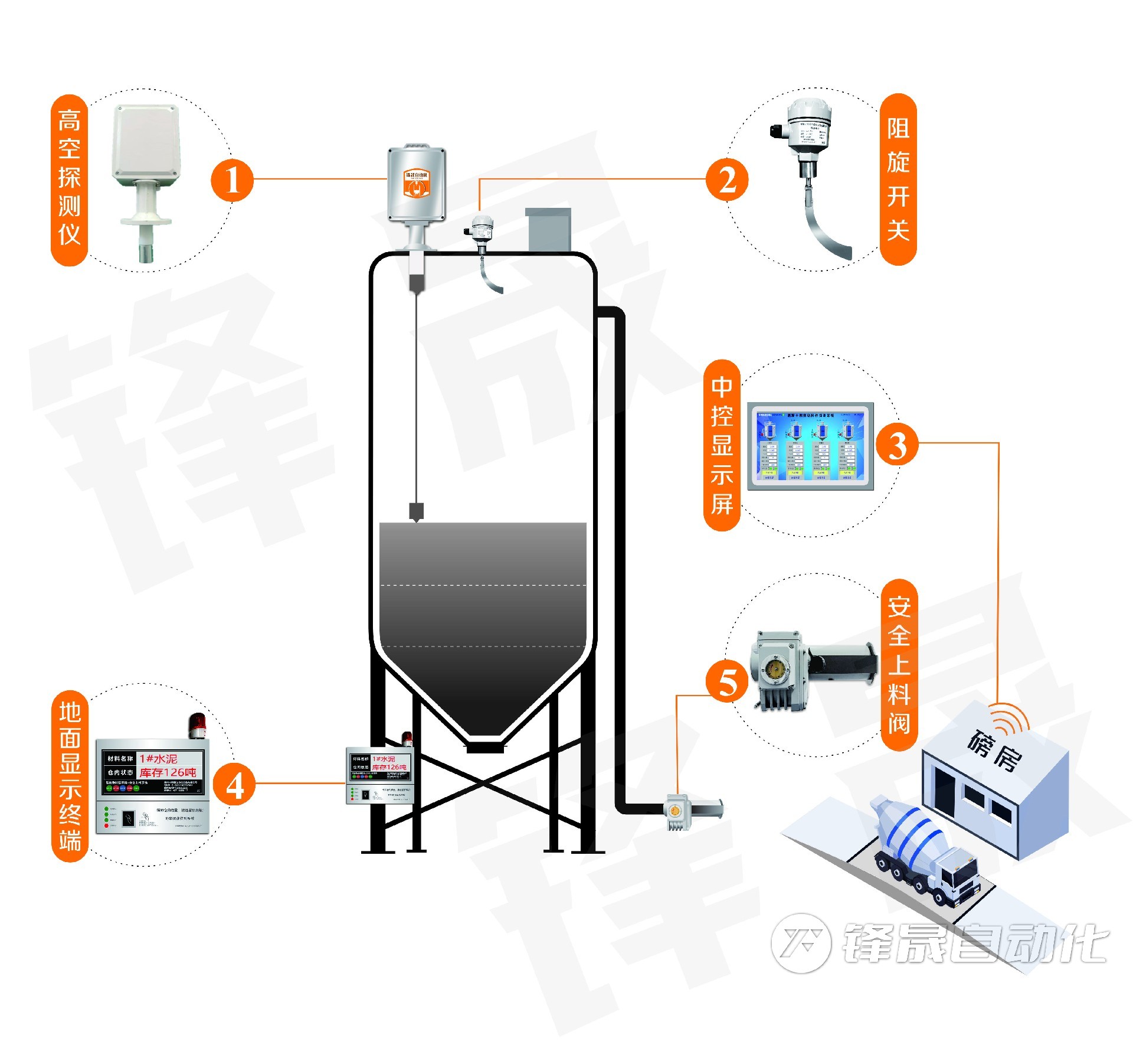 4、測(cè)余量:實(shí)時(shí)監(jiān)測(cè)粉料倉(cāng)余量,代替人工敲錘,避免工人不敲和人身事故。